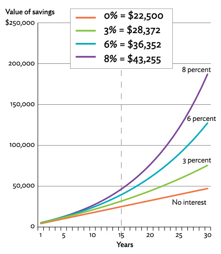 فرض کنید که هر ماه ۱۲۵ دلار برای سرمایهگذاری کنار بگذارید. نمودارهای زیر مقدار کل پول به توجه به بهرههای مرکب متفاوت نشان میدهند. (سود مرکب صفر (No Interest) به معنی نگه داشتن پول بدون سرمایهگذاری مثلا داخل گاوصندوق است)